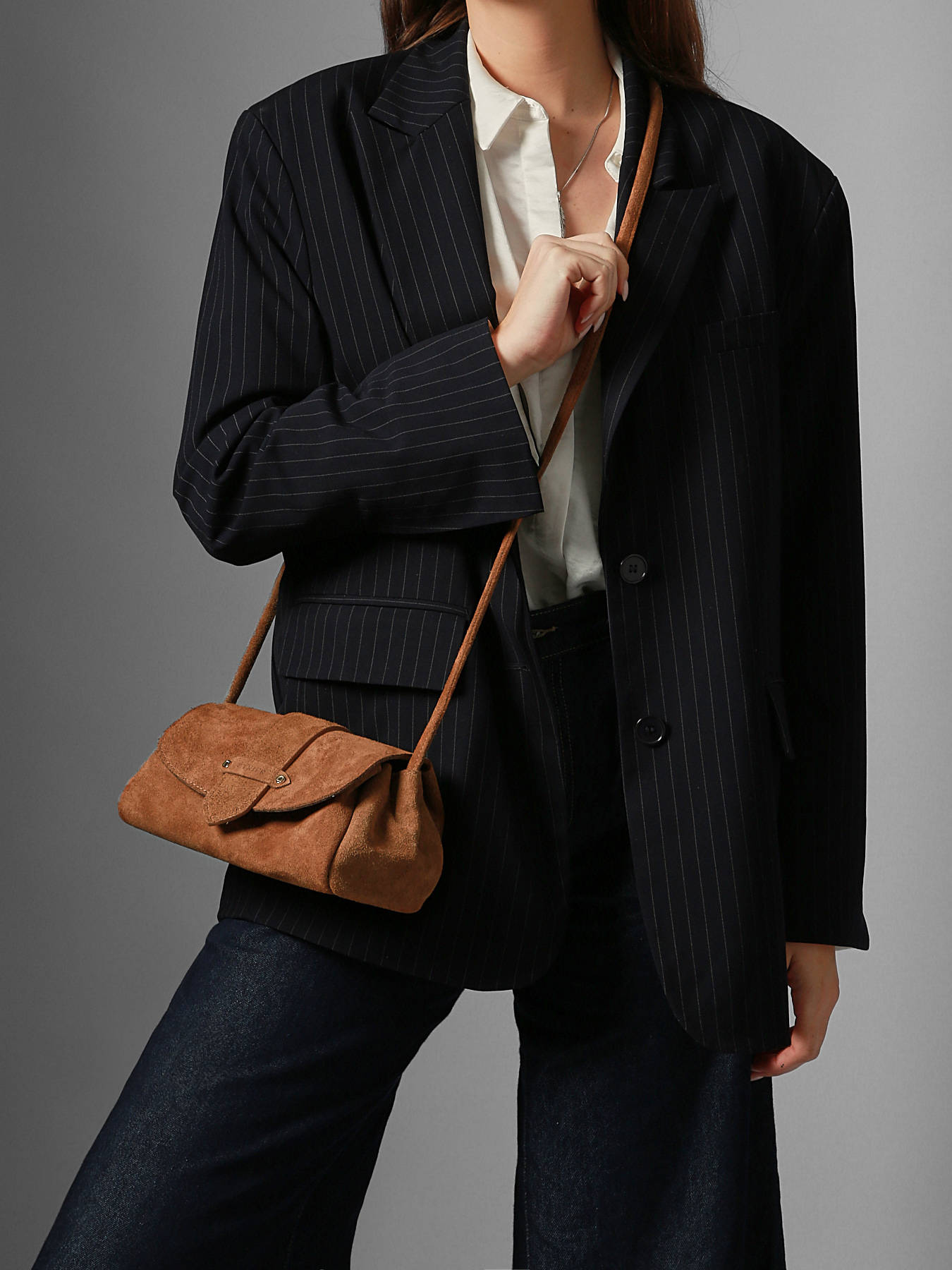 The AGNES crossbody bag by ETRIER is crafted from Italian suede leather, offering a soft and refined texture. This model is shown here in size S and features a flap closure secured with a magnetic snap button. It is also available in size M for those who prefer a roomier option.